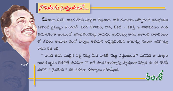"అబ్బే... ఇది డబ్బుల్లో తేలే యవ్వారం కాదు. గోదారి అమ్మోరమ్మలా ఉంది. ఏలు పెడితే లాగేసేలా ఉంది. హాయిగా ఈ వానలో ఇలా మనగదీసుక్కూసోడం... వాన్నీ గోదార్నీ సూడ్డం తప్ప మరేటీ సైలేం..."