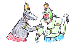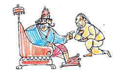 మహా మంత్రి : క్షమించండి మాహారాజా, నా చెప్పులు చంకలో పెట్టుకోవడం మరిచాను (మోకాళ్ళు వంగి నమస్కారం చేస్తూ) |