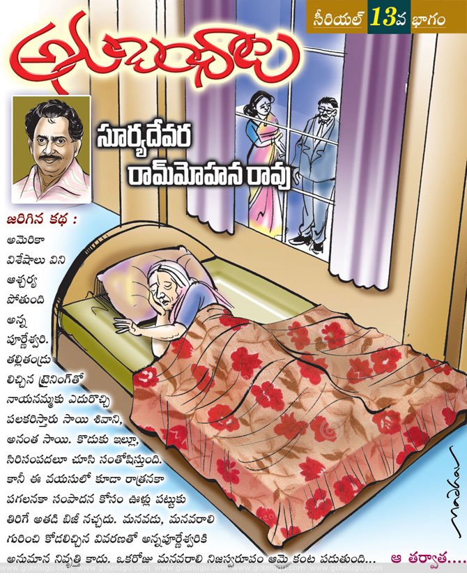 "వద్దురా. మీరు కంగారు పడక్కర్లేదు. మనసులో బాధకన్నా ఈ జ్వరం ఎక్కువేమీ కాదు. అదే తగ్గిపోతుందిలే" అంటూ కళ్ళు మూసుకుంది అన్నపూర్ణేశ్వరి. "ఓ. కె. ఇలా జ్వరంతో వుండి నువ్వు ఇండియా వెళ్ళలేవు. జ్వరం తగ్గితేగాని ప్రయాణం ఏర్పాట్లు చేయడానికి సాధ్యం కాదు. టాబ్లెట్స్ వేసుకొని పాలుతాగు" అంటూ తనే జ్వరం మాత్రలు మింగించి, పాలు తాగేవరకూ దగ్గర కూర్చున్నాడు గోపాల్.