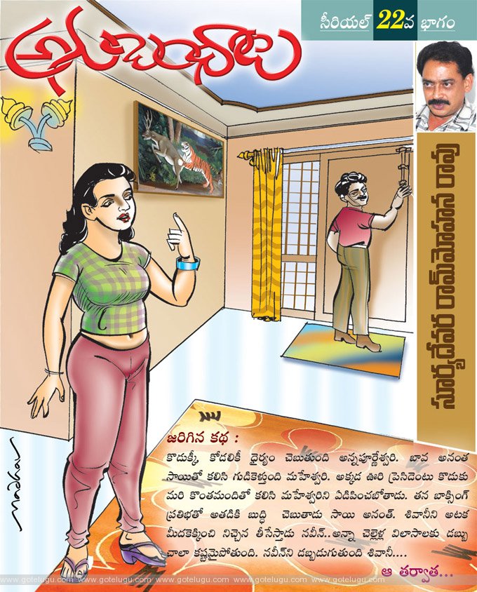 "చూస్తాను... వాడికి వుంది... చెప్తా" అంటూ విసవిసా బయటకొచ్చేసింది. ఆ కోపంలోనే ఆమె నవీన్ ని వెదుకుతూ మండువా లోగిట్లోకి వచ్చేసింది. సరిగ్గా అప్పుడే అనంతసాయి లోనకొస్తూ కన్పించాడు.