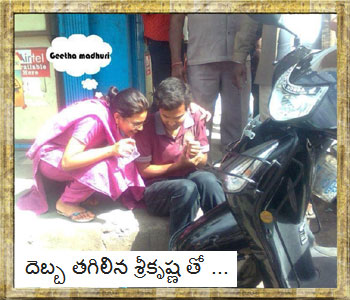 " అదా ... తను స్కూటర్ మీద నుంచి పడ్డాడు. నేను వెళ్ళి చూస్తున్నాను. ఇంతలో కొంతమంది చూసి దగ్గరకి వచ్చి - " మీరు శ్రీకృష్ణ కదండీ ... మీరు ఫలానా పాట బాగా పాడేరండీ ... ఇప్పుడు ఏ సినిమాల్లో పాడుతున్నారండీ " - అని దెబ్బ సంగతి పట్టించుకోకుండా అడుగుతుంటే - తను లేచి కదలకుండా " ఆ ... హలో ... థాంక్యూ ... " అంటూ వివరాలు చెప్తుంటే ఆటోమాటిగ్గా నవ్వు వచ్చేసింది. పైగా తను పడడం పడడమే కామెడీ గా పడ్డాడు లెండి . ఈలోగా ఎవరో కెమెరా క్లిక్ మనిపించి ఫేస్ బుక్ లో పెట్టేశారు. అది పడక పడక మీ చేతిలో పడింది"