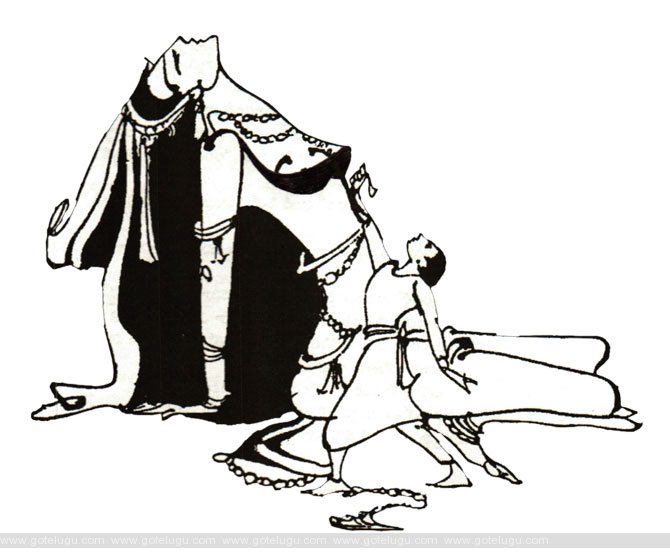 దగ్గరకొచ్చి ఆ స్త్రీ చటుక్కున వాడి రెండు కాళ్ళూ ఎత్తి ఓ పక్కకి లాగేసి కిందికి చూడమని సైగ చేసింది. ఒక సొరంగం కనిపించింది. ఇంకా లోపలికి చూస్తే పర్షియన్ తివాచీలు పరిచి వున్న విశాలమైన హాలు కనిపించింది. కాస్త దూరంగా ఒక సింహాసనం. దాని మీద రాజుగారు కూర్చునున్నారు. చిలకపచ్చ రంగులో వున్న వదులు పైజామా వేసుకునున్న ఆ రాజావారి సుకుమారమైన పాదాలకి జరీ పాదరక్షలు తగిలించి వున్నాయి. ముట్టుకుంటే కందిపోయేట్టున్న ఆ పాదాలు గులాబీరంగు ముఖమల్ పాదపీఠం మీద వున్నాయి. అక్కడ్నుంచి తల పైకెత్తితే రాజావారు ధరించిన ధగధగా మెరిసే రత్నాల కిరీటం కనిపించింది తప్ప, పెద్ద నీడ పడుతుండటం వల్ల ముఖం కనిపించలేదు.
