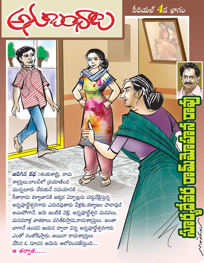 ఇదే సమస్య గురించి ఆలోచిస్తూ అన్నపూర్నేశ్వరి అక్కడ హాల్లోనె చాలాసేపు ఒంటరిగా కూర్చుండిపోయింది. అంతలో పక్కింట్లోంచి భ్రమరాంబ లోనకు రావడంతో ఆవిడ ఆలోచనలు చెదిరిపోయాయి. పెద్ద స్టీలు కారేజీ ఒకటి తీసుకుని వస్తోందామె. ముఖం లో విసుగు కనిపిస్తోంది.